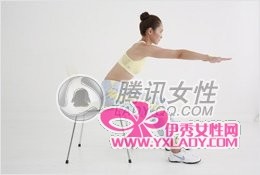 1. 双腿叉开,浅坐在椅子上,向前伸直双臂。下半身固定,腰部使力,上半身向前倾斜45°。