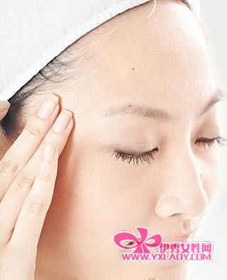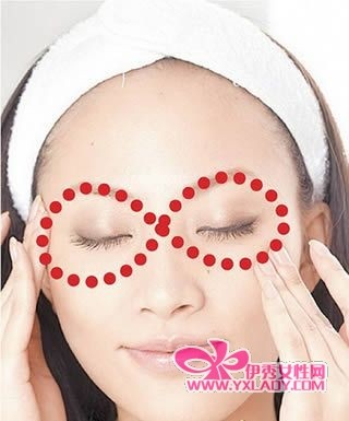 想像双眼横躺一个8字型,再用左手中指与无名指指腹以弹跳方式轻轻按压,从右边眉尾开始,往左边眼睛下方按摩,再往上绕至左侧眉毛,最后回到右眼尾依序按完这个横躺的8字型,一共进行3次,能刺激眼周血液循环,淡化黑眼圈,并将淋巴液引流至太阳穴上的淋巴结。