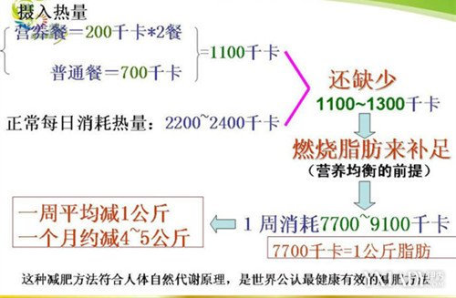 所以就需要:营养奶昔代餐,它就是低热量,全面均衡营养,世界上最好的一餐饭。 简单的说减肥原理,就是营养奶昔是一餐丰盛大餐的营养(人体必须的蛋白质等41种营养素全有了,保障营养均衡,健康不伤身!),但营养奶昔只含有相当于一个苹果的热量(一餐只有200千卡,低热量),当人体摄入热量低于消耗,就会调动身体脂肪燃烧供给身体所需,这样不知不觉中就减肥啦。